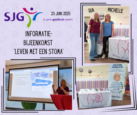 Informatieavond bij Sint Jans Gasthuis in Weert. | Op 23 juni stonden onze vrijwilligers Michelle en Ria namens Stomaatje weer met een stand op de jaarlijkse informatieavond voor stomadragers in het Sint Jans Gasthuis in Weert. Michelle: “Het was druk! Bijna 40 bezoekers, veel vragen en mooie gesprekken. Naast ons waren ook de Stomavereniging en verschillende leveranciers van stomamaterialen aanwezig.” Ria: “En ik mocht mijn persoonlijke verhaal vertellen! Spannend, maar zo waardevol — en de positieve reacties uit de zaal waren hartverwarmend. Daarnaast waren er interessante presentaties over huidproblemen en ingestuurde vragen van bezoekers.”