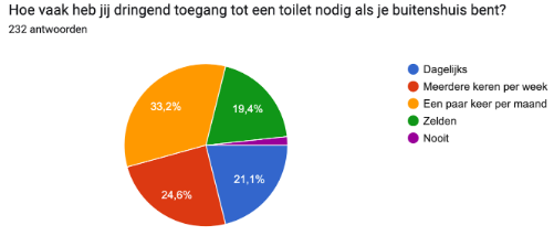 - 21,1% van de respondenten van de enquête geeft aan zelden of nooit de behoefte te hebben aan het bezoeken van een toilet buitenshuis;