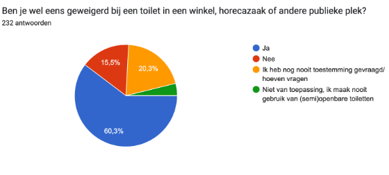 Bij het zoeken naar een beschikbaar toilet zijn er twee opties voor toiletten: openbare toiletten en toiletten in min of meer publieke gelegenheden. Wat betreft de laatste blijkt dat personeel van dergelijke gelegenheden met regelmaat nul op rekest geeft, wanneer er om toegang tot een toilet wordt gevraagd. Dit gaat om bijna twee derde van de respondenten, 60,3%.