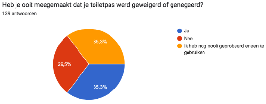 Van de stomadragers die een toiletpas hebben, meldt ruim een derde (35,3%) dat de toiletpas weleens wordt geweigerd. Bijna een derde (29,5%) heeft nog geen toiletpas gebruikt, terwijl ook ruim een derde (35,3%) aangeeft nog niet tegen een weigering aangelopen te zijn.