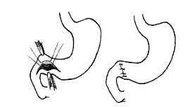 Een gestoorde maaglediging kan soms worden behandeld door het maagklepje (maagportier of pylorus) wijder te maken. De meest gebruikte methode hiervoor is die van Heineke-Mikulicz, waarbij de pylorus in de lengterichting wordt opengesneden en vervolgens in dwarse richting weer wordt gesloten. (Bron afbeelding: Het boek "Chirurgie" door J.T.E. de Jong)