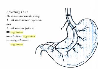Als eerste de vagotomie. Hierbij worden bepaalde zenuwvertakkingen die naar de maag lopen (de nervus vagus) geheel of gedeeltelijk doorgesneden zodat de zuurproductie stopt. Gelukkig wordt deze techniek dankzij de ontwikkeling van verschillende soorten maagzuurremmers tegenwoordig bijna niet meer toegepast. (Bron afbeelding: Het boek "Chirurgie" door J.T.E. de Jong)