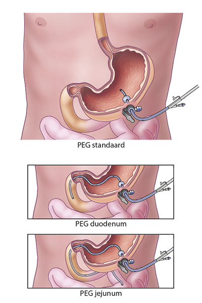 Je hebt verschillende varianten van de PEG. De PEG waarbij de sonde in de maag ligt is de standaard PEG. De sonde kan via de maag worden doorgeschoven naar de twaalfvingerige darm, dit noemt men de PEG duodenum. Dit wordt niet vaak gedaan omdat de katheter zeer snel terugkomt naar de maag. En ten slotte kan de sonde worden doorgeschoven naar de dunne darm, dit wordt een PEG jejunum genoemd. Deze wordt wel vaak aangelegd. Dit is dan een PEG-J die via de maag is doorgelegd naar het jejunum.