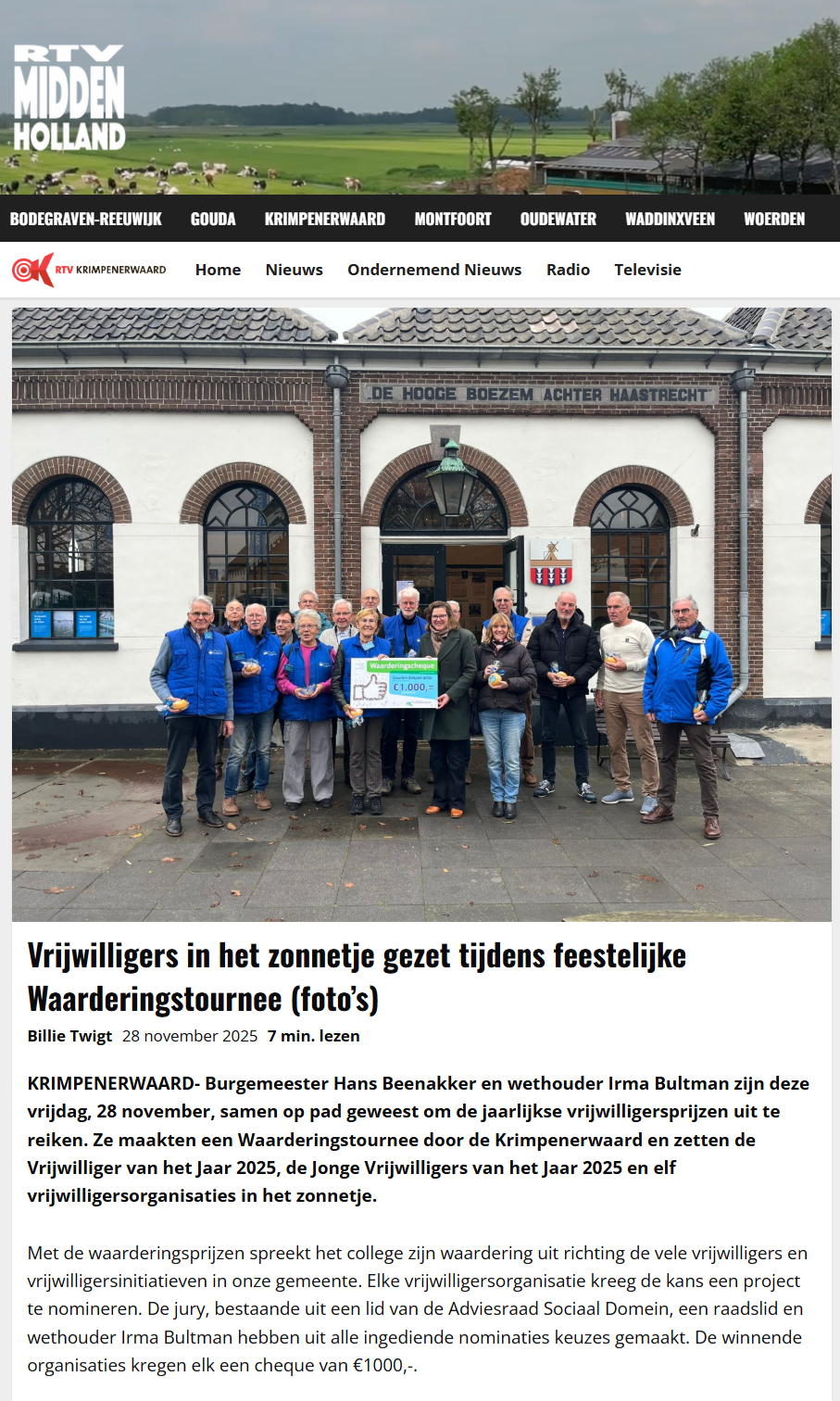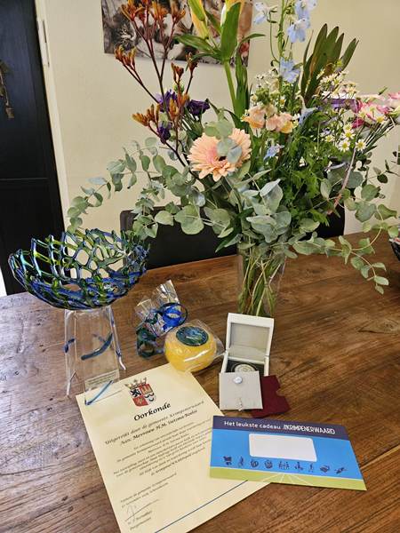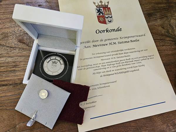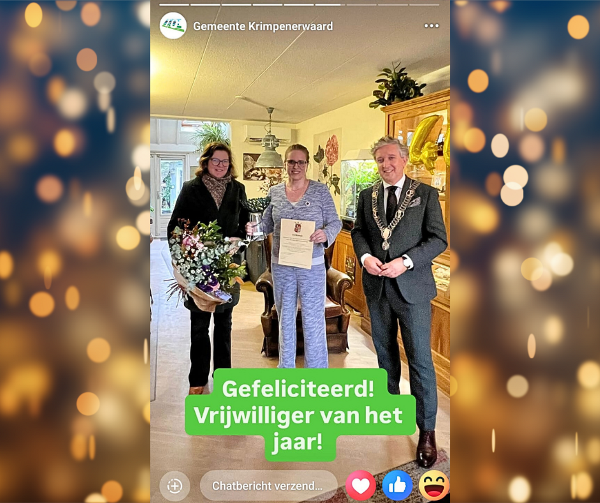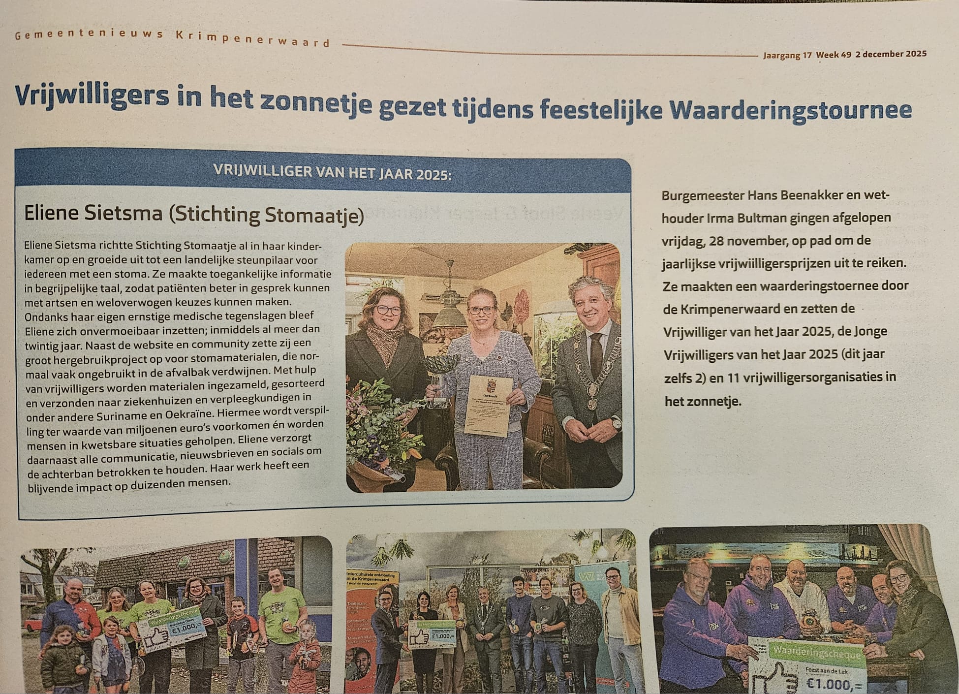 Ze is ‘Vrijwilliger van het jaar 2025’ geworden! Voor haar jarenlange inzet voor Stichting Stomaatje. 🥰 Ze ontving een mooie bos bloemen, een bijzondere bokaal, een cadeaubon, een boerenkaasje, een oorkonde met bijbehorende speld en een erepenning. Erg bijzonder – die wordt zelden uitgereikt!