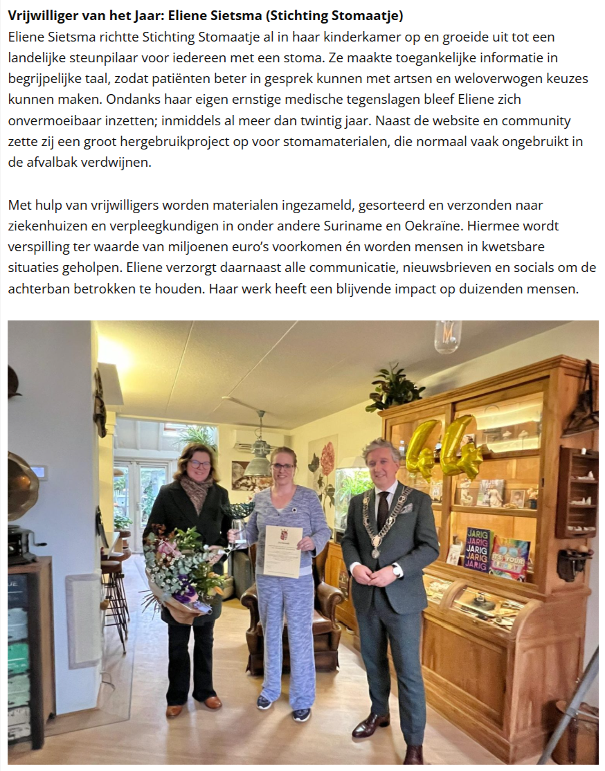Vrijdag 28 november werd Eliene, oprichtster van Stichting Stomaatje en al ruim 20 jaar actief als vrijwilliger, compleet verrast: ineens stonden onder andere de regionale televisie, de krant en de burgemeester in vol ornaat bij haar op de stoep.